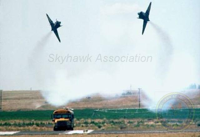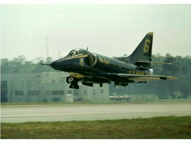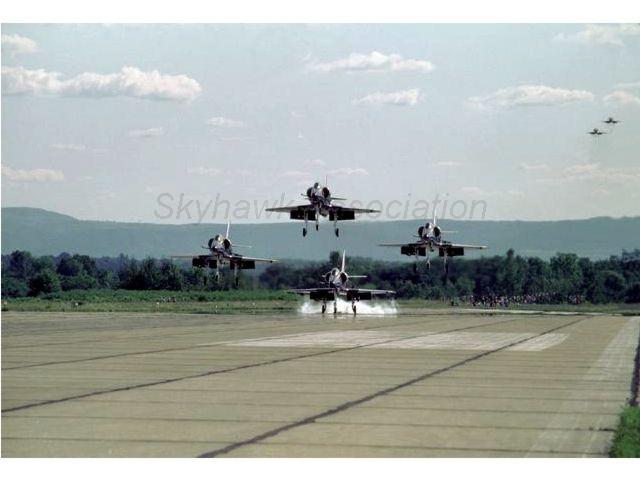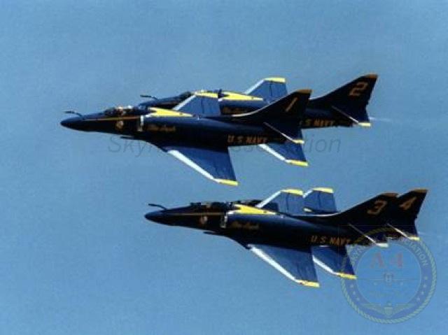 Blue Angels #1 and the Blue Angels Bluejackets pose in front of BuNo 154983. Photo marked "Casey Jones" who was the CO 76-77. Gary Verver. 09-Oct-1976: Blue Angels Skyhawk BuNo 155029, #5 and #6 doing the inverted thing. Gary Verver Collection 09-Oct-1976: Blue Angels Skyhawk BuNo 155029, #3, parked on the flight line. Gary Verver Collection Blue Angels A-4F BuNo 154975, #5, dated 18 Dec 1976. Photo by I. H. Waddington, G. Verver 1977 Gary Verver photo of the Skyhawk line at the Ft Collins airshow. 1977: Blue Angels Skyhawk BuNo 154975, #3, parked on the ramp. Unknown Photographer via W. Mutza 20 August 1977 Blue Angels Skyhawk BuNo 154975, #3, parked on the flight line. Gary Verver Collection SEP 1977: Blue Angels Skyhawk BuNo 154179, #1, assigned to CDR Casey Jones. Dave Steinbacker. 07FEB77: 07 Blue Angels Skyhawk BuNo 158722, #7, parked on the ramp. BuNo 158722 served with the team from 05 Dec 1973 to 01 May 1987 Gary Verver Collection. 1977: Blues lined up and ready to go. JUL77: Blue Angels over the Golden Gate. Probably during a 2 day airshow at NAS Moffett in July 77. Gary Verver. 1977: Fat Albert (Marine C-130) and TA-4 BuNo.158722 at the Ft Collins, CO airshow in 1977. Gary Verver photo. Blue Angels over their winter training site? Estimated to be 1977 at El-Centro. Gary Verver. 1978 09SEP78: Blue Angels Skyhawk BuNo 155029, #1, parked on the flight line. Gary Verver Collection. Blue Angels Skyhawk BuNo 154176, #3, parked on the ramp. Gary Verver Collection. 1973 - 1978: Blue Angels Skyhawk BuNo 158722, #7, parked on the ramp and configured with a pair of drop tanks. BuNo 158722 served with the team from 05 Dec 1973 to 01 May 1987. Blue A-4F Angels - 1978 USN Photograph from Gary Verver. 1979 Navy Blue Angels fly Skyhawks in spectacular vertical climb during flight demonstration programs. Douglas photo from my collection that was part of the 27 Feb 1979 News Release from McDonnel Douglas. Readable BuNo's are: #1 BuNo. 154983, #2 BuNo 154177 & #6 BuNo 154986. From Gary Verver Collection. Navy Blue Angels fly Skyhawks in spectacular vertical climb and then in a dive during flight demonstration programs. Harry S. Gann Photos. Blue Angels Skyhawk BuNo 155029, #1, on display along with the exhibit and ceremony for the last Skyhawk built by McDonnell Douglas Corporation. Photo dated 27-Feb-1979 U.S. Navy photo by SGT Frank Refuerzo. 14 MAR 1979: Two A-4 Skyhawk, Blue Angel aircraft are sitting on the flight line as an AV-8A Carrier aircraft hovers overhead at MCAS Cherry Point, NC. CPL Bryan Fitzgerald. APR79: BuNo 155029, #1, parked with 4 shipmates. Gary Verver Collection. 1979: Blue Angels Skyhawk flightline: BuNo 155029, #1; BuNo 154177, #2; BuNo 154986, #3; BuNo 154176, #4; 154975, #5 and BuNo 154179, #6. David Steinbacker 1979: flightline, r-l: BuNo 155029, #1; BuNo 154177, #2, BuNo 154986, #3; BuNo 154176, #4, BuNo 154975, #5; and BuNo 154179, #6. Dave Steinbacker. BuNo 154177, #2, parked on the flight line. Gary Verver Collection. Blue Angels in formation with "Fat Albert". BuNo 155029 (#5) and 154975 (#3) can be identified. Photo courtesy of John Gabbard. APR79: BuNo 158722, #7, looking smart. Gary Verver Collection. Dates unknown: BuNo 158722, resting alone. Pic2. Gary Verver Collection. 1980 1980: Blue Angels Skyhawk flightline, l-r: BuNo 155029, #1; BuNo 154179, #2; BuNo 154986, #3; BuNo 154176, #4; BuNo 155033, #5; and BuNo 154983, #6. David McLaren. 1980: Blue A-4F Angel BuNo. 154172. McDonnell/Douglas USAF KC-10 serial number 79-1711 (aircraft #1,711 contracted for in 1979) refueling Douglas A-4F BuNo. 154172. Blue Angels Skyhawk BuNo 154177, #1, parked on the ramp with a centerline tank. Gary Verver Circa 1980: right front view of Blue Angels Skyhawk BuNo 155029, #1, parked on the ramp. Gary Verver Collection. 1980: BuNo 155029, #1, parked as #1 on the line. Gary Verver Collection. 10 May 1980: Blue Angels Skyhawk BuNo 154975, #6, and the Blue Angels flight line. US Navy Photo. 04OCT80: Blue Angels Skyhawk BuNo 158722, #7, parked on the ramp and configured with a pair of drop tanks. Gary Verve.r 1980: Blue Angels Skyhawk BuNo 154983, #6 on the flight-line. David McLaren. 1980: 1980: Blue Angels Skyhawk flightline: BuNo 155029, #1; BuNo 154179, #2; BuNo 154986, #3, BuNo 154176, #4, BuNo 155033, #5 and BuNo 154983, #6. David McLaren. 10 MAY 1980: Blue Angels Skyhawks #1 through #6 on the taxiway. U.S. Navy. 10 MAY 1980: Blue Angels Skyhawks diamond formation flies over two B-25's on the China Lake flight line. U.S. Navy. 10MAY80: Blue Angels Skyhawks diamond formation flies by the VX-5 flight-line. U.S. Navy. Blue A-4 Angel #7 Ready to take a VIP for the ride of a lifetime. Photograph from John W. Hays. Blue A-4 Angel #1, #2, #3 & "Huffer". Photograph from Bill Kistler. Blue A-4 Angel #3 and #4 Standby for another airshow. Photograph from John W. Hays. Stunning image of a Blue A-4 Angel taking off. Photo taken at the end of Forrest Sherman field, NAS Pensacola, Florida. Photograph from Planework. The Blue A-4 Angel Six Plane Delta Formation. Photograph from Bill Kistler. The Blue A-4 Angel Six Plane Delta Formation. Photograph from Bill Kistler. Two Blue A-4 Angels make a dirty low pass in an unusal way. Photograph from Bill Kistler. The world famous Blue A-4 Angel Diamond Formation. Photograph from Bill Kistler. Blue A-4 Angel #6 makes a screaming low pass down the runway. Photograph from John W. Hays. The Blue A-4 Angel Diamond Landing. Photograph from John W. Hays. A Blue A-4 Angel gone to pasture. Photograph from Bill Berongi. Blue Angels at Naval Air Station, Patuxent River, MD . Photograph from collection of Gary Verver. 1981