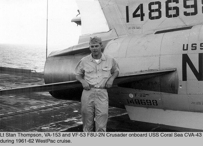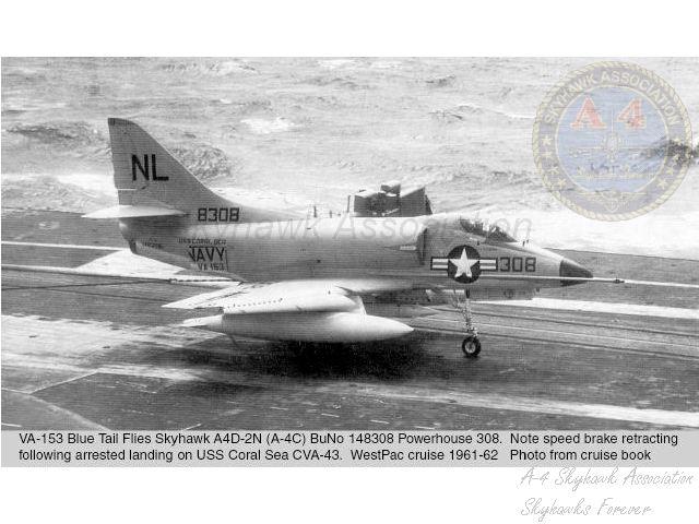Events September 1949: Naval Air Reserve Fighter Squadron SEVEN HUNDRED EIGHTEEN (VF-718) was re-designated Fighter Squadron EIGHT HUNDRED THIRTY ONE (VF-831) at Naval Air Station New York Floyd Bennett Field. VF-718 and VF-831 both flew the Grumman F6F Hellcat. February 1, 1951: VF-831 Blue Tail Flies were called to active duty at Naval Air Station New York Floyd Bennett Field. April 1, 1951: VF-831 moved its home-port to Naval Air Station Alameda, California where the squadron transitioned into the Grumman F9F-2 Panther. September 8, 1951 to May 2, 1952: VF-831 Blue Tail; Flies flying the Grumman F9F-2 Panther under CVG-15 embarked on United States Ship Antietam CV 36 for combat over Korea. Grumman F9F-2 Panther BuNo. 125083 NL 300 is pictured on Antietam. USN Photograph. May 5, 1952: Upon return to CONUS VF-831 moved its home-port to Naval Air Station Moffett Field, California. January 24, 1953 to September 21, 1953: VF-831 flying the Grumman F9F-5 Panther under CVG-15 embarked on United States Ship Princeton CV 37 for a second combat cruise to Korea. February 4, 1953: VF-831 was re-designated Fighter Squadron ONE HUNDRED FIFTY THREE (VF-153 Blue Tail Flies) while deployed in Korean waters. August 1, 1954 to February 28, 1955: VF-153 Blue Tail Flies flying the Grumman F9F-6 Cougar under CVG-15 embarked on USS Yorktown CVA 10 for a cruise to WestPac. February 1955: Blue Tail Fly aircraft flew sorties from Yorktown in support of the evacuation of Chinese Nationalists from the Tachen Islands. December 15, 1956: VF-153 was redesignated Attack Squadron ONE HUNDRED FIFTY THREE (VA-153). The Blue Tail Flies were assigned the Douglas A4D-1 (A-4A) Skyhawk. The Squadron completed A-4A Skyhawk transition February 12, 1957. February 20, 1957: Cdr. Alexander D.C. Byers, 38, CO of VA-153 at NAS Moffett Field, was killed yesterday when his A4D (BuNo 142147) crashed into San Francisco Bay about one mile south of International Airport. The Daily Review, Hayward, CA, Thursday, Feb. 21, 1957. Cdr. Alexander D.C. Byers, 38, CO of VA-153 at NAS Moffett Field, was killed yesterday when his Skyhawk apparently developed engine trouble at a low altitude. He ejected, but the chute failed to open completely before he hit the water. He was recovered by a Coast Guard crash boat 8 minutes after his plane plunged into the water off the San Francisco International Airport. Oakland Tribune, Thursday, February 21, 1957. October 21, 1957: Lt. Robert T. Rich, 28, was killed when he crashed during a night practice bombing run at Fallon, NV. Rich was member of VA-153 at Moffet Field. Long Beach Independent, Wednesday October 23, 1957. Lt. Robert T. Rich, 28, was killed last night when his Skyhawk (BuNo 142143) crashed and exploded on a practice bombing run 10 miles SW of NAAS Fallon, NV. VA-153 was TAD to Fallon from NAS Moffett for bombing practice. The explosion was seen by Fallon residents about 9:45 p.m. Reno Gazette, Tuesday, 22 October 1957. November 21, 1957: Lt(jg). Douglas O. Sanford, 22, was killed Thursday night when his Skyhawk (BuNo 142217) jet caught fire hit the field and exploded during landing practice at Crows Landing. Redlands Daily Facts, Friday, Nov. 22, 1957. His A4D jet crashed to earth and burst into flame near Ward Ave., about three miles southwest of NALF Crows Landing on the Covell ranch about 200 feet off Ward. August 23 to September 9, 1958: The Blue Tail Flies flew sorties in the Taiwan Straits after the Chinese Communists bombarded Quemoy Island. October 27, 1958: VA-153 was assigned the Douglas A4D-2 (A-4B) Skyhawk. June 21 1959: Lt(jg). Alvin Allen was on a cross country when the Oil Pressure Flip/Flop Gauge became erratic prompting him to execute a "Precautionary Flameout Approach" to NAS Kingsville. With excessive speed the aircraft touched down 4,000 ft. down the runway, the tailhook was pulled from the aircraft, Field Arresting Gear failed, the fuselage and wing separated and caught fire off the runway end. Lt(jg). Allen was uninjured. From Jim Doolittle, VA-153 Maintenance Officer in 1959. February 15, 1960: Lt(jg). Gordon N. Blake and a housewife were killed when his VA-153 Skyhawk (BuNo 142919) hit a house on Emily Drive as he was coming in for a landing. The crash occurred a half mile from Moffett Boulevard, near NAS Moffett Field. Blake was seen to eject and to come down into the home his Skyhawk hit which, according to an eyewitness, was just an inferno. The Skyhawk glanced off the front part of the roof, crashed into a field and broke in half. The site is just south of the Bayshore highway just inside the Mountain View City line. San Mateo Times, Monday, February 15, 1960 September 8, 1960: Lt(jg). Richard E. Morton (VA-153 based at Moffett Field) was killed last night when his A4D-2 Skyhawk (BuNo 142925) plunged upside down just in front of the USS Coral Sea 115 miles NW of Santa Cruz due to insufficient airspeed on a night launch. Oakland Tribune, Friday, September 9, 1960. 2205 A4D BuNo 142925 with pilot LTJG R.E. Morton, USN, crashed into the water off the port bow at Latitude 37-32.2 N, Longitude 122-45.2 W, following an unsuccessful port catapult launch. Ship's course is 300, speed 27 knots. Commanding Officer ordered left 5 deg. rudder and all engines stop to avoid the aircraft. USS Preston and USS Everett F. Larson commenced searching for the pilot. Maneuvering to remain clear of search area. 2310 Motor Whaleboat from USS Preston came alongside and delivered the pilot's helmet and part of the aircraft recovered in their search. 2335 USS Coral Sea discontinued search and c/c to 089, c/s to 17 knots. USS Preston detached. USS Everett Larson ordered to remain at the crash area and search for the pilot until sunrise. USS Coral Sea deck log, 8 September 1960. September 19, 1960: USS Coral Sea (CVA 43), with VA-153 embarked, operated in the South China Sea after Pathet Lao forces captured strategic positions in Laos. January 6, 1961: Lt. Tom Joseph Cress was killed when his A4