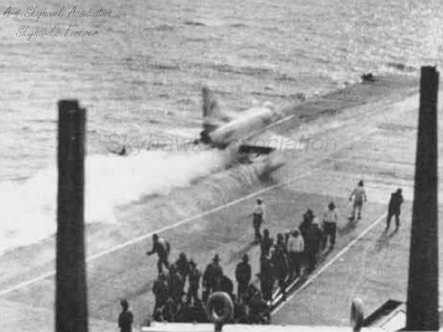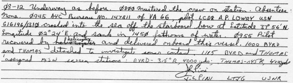 Events February 1, 1951: Reserve Fighter Squadron SIX SEVENTY-ONE (VF-671) was called to active duty and assigned the F4U-4 Vought Corsair I. June, 1952: VF-671 was assigned the F8F-2 Grumman Bearcat. December, 1952: VF-671 was assigned the F9F-5 Grumman Panther. January through February 1953: VF-671 / VF-81, with its F9F-5 Panthers participated in operational tests aboard the Navy's first angled deck carrier, USS Antietam CVA 36. February 4, 1953: VF-671 was redesignated Fighter Squadron EIGHTY-ONE (VF-81). April 1954: VF-81 became the first operational fleet squadron to receive and operate the Vought Cutlass. July 1, 1955: VF-81 was re-designated Attack Squadron SIXTY-SIX (VA-66). August 1956: VA-66 started to receive the F9F-8B Grumman Cougar. March 1958: VA-66 started to receive the A4D-1 Douglas Skyhawk. June 1958: VA-66 started to receive the 4D-2/A-4B Douglas Skyhawk. May 27, 1959: Cdr. Wilfred J. McNeil Jr. (VA-66 CO,) 38, son of US Asst. Def. Sec. W.J. McNeil, is missing after a Wednesday night plane crash in the Med. Cdr. McNeil disappeared when his Skyhawk jet (BuNo 142776) crashed while practicing controlled approaches off the USS Intrepid. Pacific Stars & Stripes, 30 May 1959. Cdr. Wilfred J. McNeil Jr. (VA-66 CO,) 38, son of US Asst. Def. Sec. W.J. McNeil, was lost at sea early yesterday when his jet attack bomber plunged into the Mediterranean. A search was abandoned after the pilot's helmet was found floating amid the wreckage and debris from the crashed plane. He was killed while practicing carrier-controlled approaches off the USS Intrepid when his A4D-2 Skyhawk plunged into the sea. Arizona Republic, Friday, 29 May 1959. 2100 While making CCA A4D BuNo 142776 pilot Cdr. W.J. McNeil Attack Squadron 66 disappeared from the controllers radar scope. USS Vesole (DDR-878) detached to search last known position of a/c, 34-56.2N, 21-08.3W, depth of water 1476 ft. 2311 Completed recovering a/c having recovered 2 AD's from SAR operations. USS Intrepid deck log, Wednesday, 27 May 1959. March 1961: VA-66 started to receive the A4D-2N/A-4C Douglas Skyhawk. May 25, 1962: Lt. Raymond W. Hill, 28, received minor burns when his A4D jet (BuNo 149534) blew a tire on takeoff, swerved off the runway and caught fire at Patrick AFB. Pensacola News Journal, Saturday, 26 May 1962. August 14, 1962: The squadron participated in cross-deck operations aboard the British carrier HMS Hermes (R-12). October through December 1962: While embarked in USS Enterprise CVAN 65, the squadron participated in the Cuban Blockade. October 26, 1962: Cdr. Kent L. Lee ejected safely … Aircraft A4D-2N, BuNo 149443 (sic), 148443 bearing 205, distance about 4 miles. Pilot Kent L. Lee, CDR, COMAIRGRU SIX ejected at 1235. Pilot landed in sea at 1240. Helo recovered pilot at 1241. Pilot returned on board uninjured at 1247. USS Enterprise deck log Friday 26 October 1962. July 31 to October 3, 1964: USS Enterprise CVAN 65, with VA-66 embarked, participated in operation Sea Orbit, the first circumnavigation of the world by a nuclear task force. The sixty-five day voyage was accomplished without replenishment. The squadron participated in numerous air power demonstrations during the voyage. October 30, 1965 to August 10, 1966: The Waldos flying the A-4C Skyhawk with Carrier Air Wing 6 cruised the Mediterranean on board USS America CVA-66. June 2, 1966: Lt(jg). Seldon M. Small ejected when VA-66 A-4C BuNo 149634 crashed into the sea 11 miles off the port quarter and sank in 1,750 fathoms of water. The helicopter and USS Leary commenced search for pilot and he was recovered without injury by the helicopter. USS America deck log, Thursday, 2 June 1966. January 10, 1967 to September 20, 1967: The Waldos flying the A-4C Skyhawk with Carrier Air Wing 6 cruised the Mediterranean on board USS America CVA-66. March 4, 1967: LT(jg). William H. Lifsey and LCdr. J.D. Rasmussen both ejected safely. 1418 an A4C aircraft Bureau No. 149543 of VA-66 piloted by LCDR J.D. Rasmussen and an A4C aircraft Bureau no. 147848 of VA-66, piloted by Ltjg W.H. Lifsey collided in mid-air at latitude 40-19.0N and longitude 05-22.5E and sank in 1,500 fathoms of water. Two parachutes sighted. Helicopter dispatched to scene of crash to recover pilots. 1440 both pilots recovered and delivered aboard this vessel. Injury reports to follow. 2255 Received injury report from aircraft accident which occurred at 1418 this date. LTJG William H. Lifsey received a fracture humeral greater tuberosity bilateral. Treatment administered by medical officer. Disposition admitted. USS America deck log, Saturday, 4 March 1967. May 25, 1967: LCdr. A.P. Lowry ejected when VA-66 A-4C BuNo 147811 crashed into the sea off the starboard bow and sank in 1450 fathoms of water. The pilot was recovered without injury by the helicopter. USS America deck log, Thursday, 25 May 1967. June 8, 1967: VA-66's aircraft were part of an Air Wing 6 strike group that was launched to defend USS Liberty AGTR 5, when she came under attack by the Israelis during the 1967 Israeli-Arab War. When word was received that the attack had been a mistake on the part of the Israelis, the aircraft were recalled. August 01, 1968: Name: Edward James Broms, Jr. August 3, 2012: From: Marjorie (Margie) Broms Waddell. To: Dear Ray (Dermody - VA-66 SDO), I have just visited the VA-66 website and have found your name as the contact person for this squadron. My brother, Edward James Broms, Jr., known by his Naval Academy and Navy Air friends as "Barney", was lost over North Vietnam while on a mission off the U.S.S. Intrepid on August 1st, 1968. Jim, as our family called him, was listed as missing in action. In 1993, an investigation of his crash site produced remains that were tested by the Navy to determine a DNA match with my mother and me. The test at that time was inconclusive. In October of 2011, I was contacted by Navy officials and learned that a subsequent test has indicated that this pilot was indeed a member of o