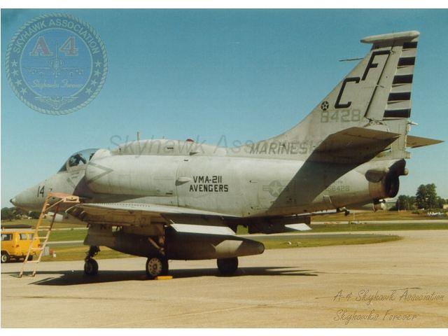 Events 1937: As Fighter Squadron 4M, the unit flew Grumman F-3F aircraft. Jan. 1941: Stationed in Hawaii, the unit was re-designated VMF-211 and flew the Grumman F4F-3 Wildcat. Nov. 1941: VMF-211 moved their Wildcats from Hawaii to Wake Island where they fought the Japanese in the following months until they were overcome. The surviving off-island personnel became the heart of a rebuilt unit named the "Avengers". They flew the F-4U Corsair throughout the remainder of WWII. 1952: While aboard the U.S.S. Coral Sea, the unit was re-designated VMA-211 1955-1956: VMA-211 and VMA-225 were components of MAG-14, Second Marine Aircraft Wing and were detached from Cherry Point to a facility some 65 miles north at NAAS Edenton, NC. Sept. 1957: It was in Sept. 57 that they (VMA-211) transitioned from the AD-4B to the A4. Their first A4D-1 (A4) Skyhawk was delivered by Major John Coffman, Group LSO and a member of 211. VMA-211's tail code at that time was AF, and they painted their rudders in alternating peppermint stick like red and white stripes, prompting us to refer to them as "Candy Asses." VMA-211 retaliated by referring to us as Wandering Idiots. A reference to our "WI" tail code. Provided by Bill Holmes, Pilot in VMA-225 1957: VMA-211 left Edenton in 1957 for westpac, Iwakuni, 1stMAW, until spring 1959 in which they left Iwakuni for CONUS with aircraft (cacooned) on a jeep carrier. They off-loaded at North Island. April 10, 1958: 1st Lt. James G. Cowart Jr. walked away unhurt when his A4D-2 BuNo 142093 crashed and burned on take-off Thurs.at NAAS Edenton. Charleston Daily Mail, Charleston, WV, Friday, April 11, 1958. I was a pilot in his squadron and saw the accident. It was a VMA-211 A4D-2. Jim aborted takeoff when he was Number 2 in a section takeoff from Edenton MCAAF, North Carolina. He went off the end of the runway at about 100 knots, went into the trees, and exploded in a ball of fire. When the fire truck got there the plane was still burning and was pretty much melted down. They found Jim behind a pine tree, peering at the fire, and in shock. He had amnesia and could not remember how he got out of the aircraft. Jim said the reason he aborted was that the lead pilot, Capt. Warfield, had become airborne and was climbing while Jim was still runway bound. So, he thought he had something wrong with the J-65 engine and made a last-minute decision to abort the takeoff. The accident investigation indicated that the aircraft had a low nose wheel oleo, causing a low angle of attack while on the ground. That in combination with too much nose down trim kept him glued to the deck longer than usual. Larry Holdridge, former Capt., USMC.
