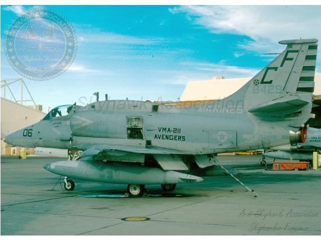 Unit Photos 17JUL59: A4D-1 (A-4A) Skyhawk BuNo. 142178 ? Picture of what appears to BuNo 142178 on July 17,1959 Atsugi Naval Air Station, Japan. Photograph by and courtesy of Toda Yasunori of Miyaginoku, Sendai, Japan. 13FEB61: VMA-211 Photo taken 13 Feb 1961, something to do with "RAPEC". The four A-4C's in the photo are 145125 CF-2, 145109 CF-15, 145113 CF-14 & 145101 CF-5. Gary Verver Collection. 1964-66: BuNo 150031, CF-1, parked on ther ramp. Gary Verver Collection. 1966: A-4C Skyhawk BuNo. 145088 - 1966. n July 1966, two VMA-211 A4C Skyhawks attended the air show at Japan Air Defense Matsusima Air Base, Japan. Color photograph by and courtesy of Toda Yasunori of Miyaginoku, Sendai, Japan. NOV 1966: BuNo 151080, CF-14 as she taxies by the photographer. Unknown photographer via W. Mutza. MAY 1967: Wake Island Avengers Skyhawk BuNo 151045, CF-5, parked on the ramp with MBER's on the inboard wing pylons. Unknown photographer via W. Mutza. MAY 1967: close-up tail insignia view of Wake Island Avengers Skyhawk BuNo 151045, CF-5. Unknown photographer via W. Mutza. Skyhawk BuNo 151078, CF-3, parked on the ramp. Unknown photographer via W. Mutza. 1966-67: Skyhawk BuNo 151088, CF-17, about to launch from the SATS with a load of Snakeyes. Unknown photographer. 1966-67: Wake Island Avengers Skyhawk BuNo 151096, CF-20, parked on the ramp next to USAF RF-101C Voodoo s/n 56-089. Unknown photographer. BuNo 151096, CF-17, as she taxies by the photographer. Unknown photographer via W. Mutza. BuNo 151190, CF-1, as she taxies by the photographer. Unknown photographer via W. Mutza. 06JUN68: BuNo.151045 at Khe Sanh, Vietnam, June 6, 1968. Provided by Ron Taylor. OCT-DEC68: VMA-211 Pilots at Chu Lai in October-December, 1968 timeframe. 25OCT68: 25 October 1968 Chu Lai, South Vietnam, Capt. Bob Miecznikowski USMC leaving the cockpit of VMA-211 (CF-11) A-4E BuNo.151193 after completing his 100th mission. Picture from Bob Miecznikowski. FEB69: Three USMC A-4E Skyhawks after a mission in the refueling pits, ChuLai Foreground VMA-223 WP-2, BuNo 151055 WP-4, and VMA-211 CF-22. Charlie Robinson. Nov 1969: BuNo 158177, CF-16, parked on the flight line. Gary Verver Collection. BuNo 158193, CF-1, parked on the ramp with two wing tanks. Gary Verver Collection. 1969: A-4E Skyhawk BuNo. 150046. VMA-211 A-4E Skyhawk BuNo. 150046, side number CF-2 takes off from Naval Air Station Atsugi, Japan, September 18, 1969. The center fuel tank was painted the same as the fuselage. The Scooter was on its way to Marine Corps Air Station Iwakuni. Photograph by Masaaki Hayakawa. 1969: A-4E Skyhawk BuNo. 151190. VMA-211 A-4E Skyhawk BuNo. 151190, side number CF-1 over Naval Air Station Atsugi, Japan, October 24, 1969. Trouble on the test flight after repair, pilot has the arresting hook down for the emergency landing. There is part of an old VMA-233 squadron patch showing on the fuselage. Photograph by Masaaki Hayakawa. 1969: A-4E Skyhawk BuNo. 151096. VMA-211 of MAG-12 A-4E Skyhawk BuNo. 151096, in November 1969 at Chu Lai, Republic of Vietnam. Morning on the flightline and a Skyhawk returns from a night hop. It's just after sunrise and this Skyhawk is being readied for the next hop. A Mark IV 20mm Gunpod sits on its trailer in the foreground. Photograph by Lore Wiseman. 1969: A-4E Skyhawk BuNo. 152032. VMA-211, A-4E Skyhawk BuNo. 152032, side number CF-9 under tow by a tug on a cold November (25, 1969) day at Naval Air Station Atsugi, Japan. This aircraft had flown in from Vietnam for repair at Atsugi. Notice the remains of a letter P (as in WP --- VMA-223) can still be seen on the tail -- aircraft were quickly transfered from squadron to squadron as they were rotated in the Vietnam theater. Photograph by Masaaki Hayakawa. 1969: A-4E Skyhawk BuNo. 152000. VMA-211 of MAG-12 A-4E Skyhawk BuNo. 152000, side number CF-3 in December 1969 at Chu Lai, Republic of Vietnam. The Avenger A4-E waits on the "Hotpad" armed with Rockeye CBUs and 5 inch ZUNI Rockets. The candy striped re-fueling probe was special for the "holidays". The VMA-211 Ordinance Shop flag waves in the background. Photograph by Lore Wiseman. NOV 1970: Skyhawk BuNo 151190, CF-1, assigned to CAPT Bill Callahan as she taxies by the photographer with an empty MBER on the centerline and 2.75" FFAR pods on the outboard pylons. Weldon Dunlap. JUN 1971: BuNo 152081, CF-23, as she taxies by the photographer. Nick Williams. 1971: A-4E Skyhawk BuNo. 149658. A-4E Skyhawk BuNo. 149658, side, number CF-24, is taxiing from the VMA-211 flight line to go on display at the Marine Corps Air Station Iwakuni open house May 16, 1971. Earlier BuNo. 149658 is pictured taxiing back to the VMA-211 flight line after a flight. BuNo. 149658 was later transfered to VC-5 Det. Cubi Point, Philippines. Photograph by Masaaki Hayakawa. During summer 1971, VMA 211 Wake Island Avengers were doing work-ups out of Naval Air Station Cubi Point, Philippines. Marine Huey gunship pilot Captain Tom Hanson recorded Avenger ground-crew readying A-4E Scooters for a practice mission. A-4E Skyhawk BuNo. 149651. A-4E Skyhawks BuNo. 151090 side number CF-1 and BuNo. 149651 CF-15 wait for armament wagons bringing bombs, rockets and stuff. 1971: A-4E Skyhawk BuNo. 149651. A-4E Skyhawk BuNo. 151090 side number CF-1 has its port drop fuel tank filled while BuNo. 149651 CF-15 waits its turn in the background. 1971: A-4E Skyhawk BuNo. 151090. A-4E Skyhawk BuNo. 151090 side number CF-1 gets its starboard drop fuel tank filled. 1971: A-4E Skyhawk BuNo. 152004. A-4E Skyhawk BuNo. 152004 side number CF-10 gets a starboard rocket pod. 1971: A-4E Skyhawk BuNo. 152004. A-4E Skyhawk BuNo. 152004 side number CF-10 goes through a preflight inspection --- including the Hell Hole. 1971: A-4E Skyhawk BuNo. 149661. An Avionics crewman checks A-4E Skyhawk BuNo. 149661 side number CF-22's black boxes before flight. Photographs copyright 2001 by Tom Hanson. 1971: After preparing the Wake Island Avenger Skyhawks it was time to fly the mission. A-