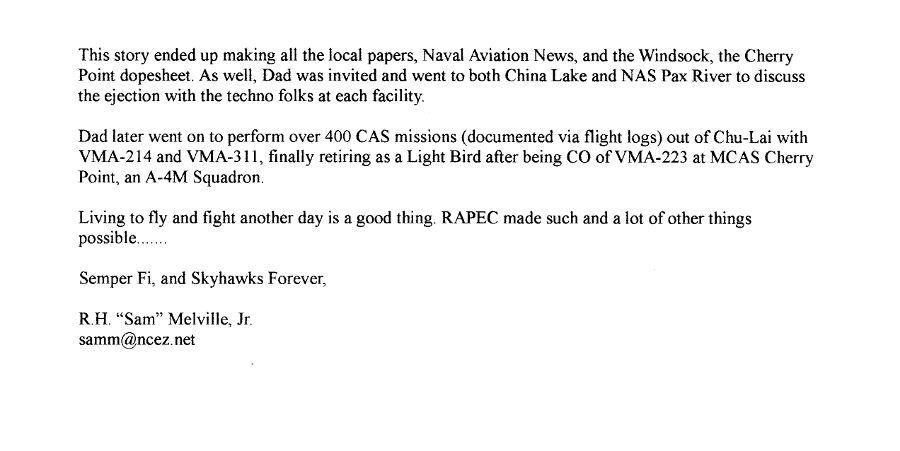 Unit Photos circa 1960: A4D-2 BuNo 145050, ED-15, Leeward Point Field, Naval Station Guantanamo Bay, circa 1960. Photo from Gary Gauer who is sitting on the wing. May 1960: A4D-2 BuNo 145051, ED-16, which was hit by a buzzard on the right corner of the windshield damaging the instrument panel and radio on 06 May 1960 and was SOC on 15 May 1960, Leeward Point Field, Naval Station Guantanamo Bay, May 1960. Photos from Gary Gauer. Pic 1, Pic 2. 1960: Nighthawks A4D-2 Diamond formation: (cw from top) BuNo 145030, ED-6, BuNo 145047, ED-12, BuNo 145023, ED-3 & BuNo 145053, ED-18, around VAP-63 Skywarrior BuNo 144827, GB-10. Photo by Dick Pitman via Bruce Hasse. 1960: Nighthawks A4D-2 Diamond formation: (L-R) BuNo 145023, ED-3, BuNo 145053, ED-18, BuNo 145030, ED-6 & BuNo 145047, ED-12, refueling VAP-63 Skywarrior BuNo 144827, GB-10. Photo by Dick Pitman via Bruce Hasse. 15 December 1960: A4D-2 144983, 1st RAPEC ejection, LT Melville and his helmet is marked RAT. Official U.S. Navy photo. From Gary Verver Collection. 1960-62: A4D-2 BuNo 145033, ED-23, parked on the flight-line. courtesy of W. Mutza 15 Mar 1961: Night Hawks A4D-2 Skyhawks BuNo 145014, ED-1 and BuNo 145027, ED-4, refueling from the Marines newest tanker & largest prop aircraft, the Lockheed GV-1. Naval Aviation News Photo. The Windsock, MCAS Cherry Point, 23 September 1960 February 1962:NAN photo of a VMA-533 crew checking the prop on a buddy store. 1964: Nighthawks A-4B Skyhawks BuNo. 144981 ED-7 & BuNo. 144985 Ed-11 on the USS Lexington, CVA-16,, flight deck. Photograph by Ron Brick. 1964: A-4B BuNo 145081, ED-1, suffering from a virulent case of measles, caught when sequestered at VMGR-252's hangar during hurricane stand down in fall of 1964. Measles undoubtedly contracted due to large numbers of 252's KC-130's being emblazoned with Skyhawk insignia when on supply route to Rosy Roads in summer of 1964. Photo property of Temple Doswell, photographer unknown. Webmaster's Note: A-4C BuNo.145081 was lost in combat on March 20, 1966 while assigned to VA-144. Pilot LTJG Jerald Lee Pinneker was KIA.