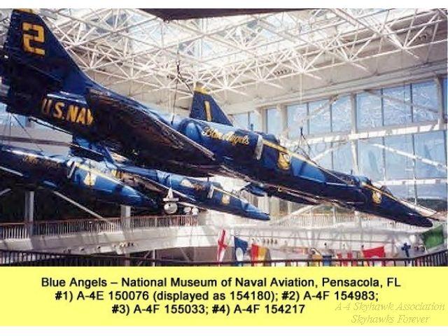 10 April 2010: Blue Angel #1 A-4E BuNo 150076 displayed as 154180, #2 A-4F BuNo 154983, #3 BuNo 155033 and #4 BuNo 154217, hang in the atrium of the National Museum of Naval Aviation.