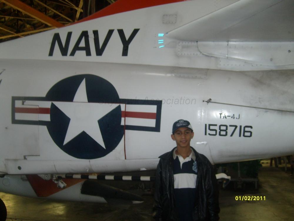 02 January 2011: "I would like to introduce you to a young new fan of the A-4 Skyhawk. I had the honor, yesterday, of taking Josh Anwar, one of my mother's friends adopted son, to the Combat Air Museum, Forbes Field, Topeka KS. Josh was able to see and touch CTW-1 VT-7 TA-4J A-711." Robert MacIntosh Hoyt, KS. Pic1 Robert's good friend Josh standing in front of TA-4J 158716; Pic2 Robert MacIntosh showing off his Skyhawk Association Patch in front of TA-4J 158716; Pic3 Robert MacIntosh posing in front of TA-4J 158716 wearing his Skyhawk Association Jacket with VFA-127 markings; Pic8 Robert's good friend Josh next to the aft fuselage and wing; Pic9 Robert's good friend Josh. Robert MacIntosh Photos.