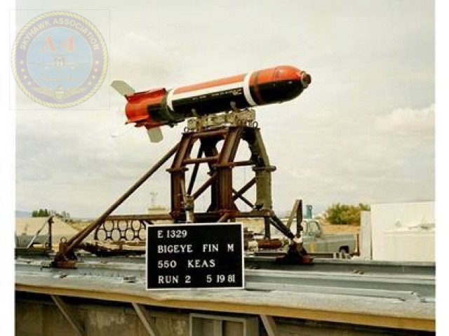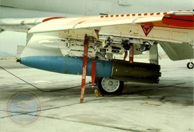 China Lake Skyhawk BuNo 142892 on the ramp with the Mk-256 bomb practice fuze project.