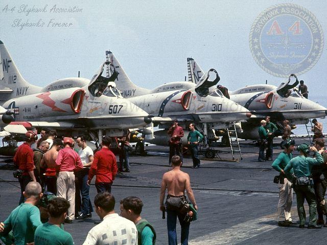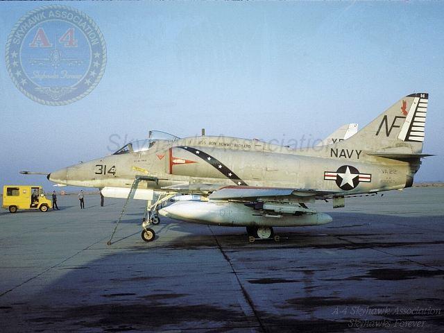 1068: A-4C Skyhawk BuNo. 147768. North Koreans captured United States Ship Pueblo in the Sea of Japan on January 23, 1968. Soon after United States Ship Ranger CVA 61 deployed from the Tonkin Gulf to the Sea of Japan, meeting five other carriers on station. Naval Air Station Atsugi was the Bingo field for the Fleet's aircraft. VA-22 A-4C Skyhawk BuNo147768, side number NE 207, takes off from Atsugi on its way back to Ranger, March 14, 1968. Photograph by Masaaki Hayakawa. 1968: BuNo 148458, NE-213 and NE-204 of VA-22. on the deck of the Coral Sea. 1968: BuNo 149581, NE-204, awaits on deck for launch along-side 149548, NE-213. Gary Verver Collection. VA-22 USS Bon Homme Richard CVA-31, WESPAC Cruise March 18 through October 29, 1969 VA-22 A-4F NF-304, BuNo 155043. MP-5 Fire Truck drill on board Bonn Homme Richard, 05 March 1969. Official U.S. Navy photo by PH3 L. D. Crouse, Gary Verver Collection. 23 February 1969: VA-22 Redcocks A-4F Skyhawk BuNo 155068, NE-203, in-flight. Official U.S. Navy photo. May 1969Redcocks, Roadrunners and Shrikes Skyhawks being loaded with ordnance aboard the Bonnie Dick. Skyhawk BuNo 151084, NF-403 in the foreground. Photo by LCDR Stan Thompson. MAY 1969: Right front view of USS Bon Homme Richard VA-22 Redcocks A-4F Skyhawk BuNo 155000, NF-307, on the ramp, NAS North Island, May 1969. Name below the canopy is LTJG Mike O'Connell. At right is S-2A Tracker BuNo 136494, 3B-858. Copyright R.W. Harrison. August 1969: VA-22 Redcocks A-4F Skyhawk BuNo 154970, NF-301, from the USS Bon Homme Richard, CVA-31, in-flight over the Gulf of Tonkin. Official U.S. Navy photo 1140516 by Lt. W.E. Bradford. 1969-70: A-4F Diamond over the Bonnie Dick - 1969. A VA-22 flight of four A-4F Skyhawks in diamond formation fly along the Bon Homme Richard CVA-31 starboard flank. U.S. NAVY photograph provided by Bryan Remer. 1969-70: The Bonnie Dick. The Bon Homme Richard CVA-31 starboard bow. U.S. NAVY photograph provided by Bryan Remer. 1969-70: Right side view of Fighting Redcocks Skyhawk BuNo 155067, NF-314, parked on the ramp. "Boom" Powell 1969-70: The Bonnie Dick. The Bon Homme Richard CVA-31 port bow. U.S. NAVY photograph provided by Bryan Remer. 1969: Passing gas - 1969. A flock of A-4F Skyhawks and a F-8 Crusader line up for gas. U.S. NAVY photograph provided by Bryan Remer. 1069: A-4Fs and F8. Three A-4F Skyhawks and a F-8J Crusader gunfighter escort. U.S. NAVY photograph provided by Bryan Remer. 20OCT69: Side View of VAQ-130 EKA-3B Skywarrior BuNo 142654,NF-616, VA-22 Fighting Redcocks Skyhawk NF-313 (BuNo unknown) and VF-53 F-8J BuNo 150672, NF-201, pilot CDR Dean Kaiser. Photo by Lt Joe Klugg piloting VFP-63 RF-8G. CDR Kaiser was later KIA. U.S. NAVY photograph copy also provided by Kent Kaiser. Official U.S. Navy photo copy also provided from the Don Scott collection. 20OCT69: Top view of VAQ-130 EKA-3B Skywarrior BuNo 142654,NF-616, VA-22 Fighting Redcocks Skyhawk NF-313 (BuNo unknown) and VF-53 F-8J BuNo 150672, NF-201, pilot CDR Dean Kaiser. Photo by Lt Joe Klugg piloting VFP-63 RF-8G. CDR Kaiser was later KIA. U.S. NAVY photograph copy also provided by Kent Kaiser. 1969: Three A-4F Skyhawks in V formation. U.S. NAVY photograph provided by Bryan Remer. 1969: Two A-4F Skyhawks escort a Russian Bear. U.S. NAVY photograph provided by Bryan Remer. CAG's Bird - 1969: CAG Cdr. Al "Shoes" Schauffelberger, Carrier Air Group 5 Commander's A-4F Skyhawk BuNo 154980 side view. U.S. NAVY photograph provided by Bryan Remer. 1969: A-4F Skyhawk catshot off of the Bonnie Dick's port catapult. U.S. NAVY photograph provided by Bryan Remer. 1969: Feet dry. A Fighting Redcock A-4F, BuNo.154217 crossing the coast of North Vietnam with a load of Mark 82, 500 pound bombs for Uncle Ho in 1969. U.S. NAVY photograph provided by Bryan Remer. 1969: VA-22 Pilots and Officers. Front rank, left to right: Bryan Remer, Will Dellicker, "Bud" Brittenham, John Tomasko, Gene Anderson, Dave Jackson, Bill Bradford, Gene Daniels, Lee ("Lurch") Reavis, Russ Wiley, (Fighting Redcock Commanding Officer) Richard T. Gaskill, holding "Romeo," official Redcock mascot, (Fighting Redcock Executive Officer) Henry Holt, George Crater, Bruce Cargill, Dick Pottratz, George Garner, John Cataldo, Mike O'Connell, Bob Leone, Mike Morrison, Joe Simeone, Clint Farmer, Al Pulk. 15MAR69: Fighting Redcocks Skyhawk BuNo 154217, NF-306, assigned to LCDR Dick Pottratz, parked on the ramp. 1969: Skyhawk BuNo 154217, NF-306, assigned to LT Mike O'Connell, parked on the ramp. Nick Williams 1969: A-4F finger four. Four plane Fighting Redcock A-4F formation --- flying from Lemoore to Fallon for a little bombing and strafing. BuNos. 154207 - NF 302; 154217 - NF 303; 154213. U.S. NAVY photograph provided by Bryan Remer. July 1969: Roadrunners Skyhawk BuNo 151191, Warpaint 515, returning from a strike in Vietnam accompanied by two VA-22 Redcocks Skyhawks. Photo by LCDR Stan Thompson. 28SEP69: Skyhawk BuNo 151112, Warpaint 507, and Redcocks Skyhawks NF-310 and NF-311 pre-launch. Photo by LCDR Stan Thompson. 1970: VA-22 A-4F Fighting Redcock Scooter BuNo. 154217 side number NF 303 piloted by Lieutenant Skip Graff off United States Ship Bon Homme Richard. The photograph was taken during workups near Hawaii for the 1970 Vietnam combat cruise. Skip Graff was killed in the early 1970's in an A-7 Corsair California desert crash. United States Navy photograph from Doug Clark and enhanced by "Buck" Rogers.