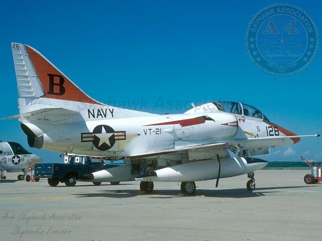 Unit Photos Circa 1969: Ramp crewmen direct newly arrived CNAVanTra Skyhawk BuNo 155072, 3E-000, assigned to RADM F.C. Turner, to it's parking spot on the flight line. Circa 1969: Ramp crewmen secure newly arrived CNAVanTra Skyhawk BuNo 155072, 3E-000, assigned to RADM F.C. Turner, on the flight line. MAR 1970: Right rear view of VT-21 Redhawks TA-4J Skyhawk BuNo 156891, 3E-146, on the ramp, NAS Miramar, March 1970. At right is F-4J Phantom II BuNo 155799. Copyright R.W. Harrison. 1970: BuNo 154314, B-129, TA-4F converted to TA-4J while at VT-21. Gary Verver Collection. 1971: BuNo 158095, 3E-140, assigned to LTJG Wantz parked on the ramp. Photo by Harry Gann, G. Verver Collection. 22OCT1972: assigned 05 MAY 1972 - 21 OCT 1976: NAS KIngsville, TX VT-21 partial left side view of Skyhawk BuNo 158123, #00, assigned to CDR C.S. Wood parked on the line on the starboard side of BuNo 155000, #002 by N. Taylor. JAN73: Fighting Redhawks Skyhawk BuNo 156936, 3E-116, assigned to R.T. Rabensburg, being guided into position by a deck crewman using a tillie bar aboard the Tico. Lionel Paul. 1973: Unknown BuNo, 3E-121, parked with single seat ladder attached. Note the 3F Bird at left. Suspect this T-Bird is BuNo 156898. Gary Verver Collection. 16 Oct 1973 BuNo 155113, 3E-133, parked on the line. Gary Verver Collection. Beautiful "Hawk" image created and provided by Gerald M. Clarke. 1979-1982: BuNo 153677, B-118 on the flight line. Left front view of VT-21 Redhawks TA-4J Skyhawk BuNo 153677, B-118 on the ramp next to VF-154 Black Knights F-4J Phantom BuNo 155580, NK-13, location unknown. Gary Verver Collection. 04 Aug 1974: BuNo 158505, 3E-125, parked on the ramp. Left side view of VT-21 Fighting Redhawks TA-4J Skyhawk BuNo 158505, 3E-125, on the ramp, 04 August 1974. Name below the canopy is LT Robinson. Unknown USAF F-104 Starfighter in the background. Gary Verver Collection. Sept 1974: Skyhawk BuNo 158500, 101, parked on the ramp. Pic2. Gary Verver Collection. VT-21 TA-4J BuNo 158082, 3E-121, on the ground at Milwaukee, WI courtesy of Bob Lawson. Date unknown: Right side view of VT-21 Red Hawks TA-4J BuNo 158082, B-121, on the ramp. Name below the canopy rail is 1/LT J. L. Maroney. Photographer unknown. 19 OCT 1975: Left rear view of VT-21 Red Hawks TA-4J Skyhawk BuNo 158087, B-130, on the ramp. Name below the canopy rail is LTJG Hess. Photographer unknown. 1975: BuNo 158495 B-131 parked on the rampe. Gary Verver Collection. 19 April 1975: BuNo 155113, B-124, parked on the line. Photo by T.R. Waddington, G. Verver collection. 19 Oct 1975: Fighting Redhawks Skyhawk BuNo 155106, B-113, assigned to CAPT Hohn parked on the ramp. Gary Verver Collection. 19 Oct 1975: Fighting Redhawks Skyhawk BuNo 155109, B-141, parked on the flight line. Gary Verver Collection. 19 Oct 1975: Fighting Redhawks Skyhawk BuNo 155112, B-135, parked on the flight line. Gary Verver Collection. 19 Oct 1975: Fighting Redhawks Skyhawk BuNo 155113, B-124, assigned to LTJG Cannell parked on the flight line. Gary Verver Collection. May 1977: Fighting Redhawks Skyhawk BuNo 155099, B-128, parked on the flight line. Gary Verver Collection. 17 APR 1978: Fighting Redhawks Skyhawk BuNo 156907, B-100, assigned to USN CAPT B. Earle manned on the flight-line. G. Verver collection via R. Dowers. Circa 1978: Skyhawk BuNo 156939, B-106, parked on the flight-line. G. Verver collection via R. Dowers. 17 APR 1978: Skyhawk BuNo 156946, B-120, parked on the Kingsville flight-line. G. Verver collection via R. Dowers. 17 APR 1978: Skyhawk BuNo 156947, B-105, manned on the flight-line. G. Verver collection via R. Dowers. 17 APR 1978: Skyhawk BuNo 158490, B-129, parked on the flight-line. G. Verver collection via R. Dowers. 17 APR 1978: BuNo 158494, B-111, parked on the flight-line. G. Verver collection via R. Dowers. 17 APR 1978: Skyhawk BuNo 158500, B-101, assigned to CO CDR Willie Gunter parked on the flight-line. G. Verver collection via R. Dowers. 17 APR 1978: Fighting Redhawks Skyhawk BuNo 159797, B-127, parked on the flight line & configured with a pair of drop tanks. Aug 1979: BuNo 155099, B-126, parked on the flight. Gary Verver Collection. APR 1980: VT-21 Red Hawks TA-4J Skyhawk BuNo 158505, B-125, on final at Tinker AFB. Copyright photo by Joe Cupido. Date unknown: BuNo 158505, B-125, parked on the ramp. Gary Verver Collection. Feb 1984 BuNo 155109, 3E-134, parked on the flight line. Gary Verver Collection. 15 NOV 1984: Right side view of a Redhawks Skyhawk AB-103 on a weapons training flight out of NAF El Centro. 03 JUN 1984: Right side view of VT-21 Red Hawks TA-4J Skyhawk BuNo 158073, B-128, on the ramp at Offutt AFB. Photo by D. Brown. 15 NOV 1984: A student pilot and an instructor perform a preflight check on a Redhawks Skyhawk B-122 before a weapons training flight. MAR 1985: VT-21 TA-4J BuNo 158505, B-100, MAR 1985 at Andrews. Name below the canopy is CAPT Jim Cartwright. Photo by G. Lebaron from Verver Collection. 22 SEP 1985: Fighting Redhawks Skyhawk BuNo 158494, B-111, seconds from trapping aboard the Lex. Dr. C.A. "Sketch" Eddy. 22 SEP 1985: Fighting Redhawks Skyhawk BuNo 158494, B-111, seconds after launching from the Lex. Dr. C.A. "Sketch" Eddy. May 1986: Fighting Redhawks Skyhawk BuNo 155088, B-101, assigned to CDR Erickson parked on the flight line & configured with a pair of drop tanks. Photo by S. Van Aken, Gary Verver Collection. BuNo 158464 side number B 104. This Redhawk Skyhawk was photographed on the tarmack at Naval Air Station Atlanta, Georga, October 2, 1992. From a photograph by Frank J. Mirande. 04 SEP 1993: 2TW-2 Skyhawk BuNo 159796, B-100, assigned to CAPT "Coach" Counts, parked on the flight line at NAF Andrews. Jim Burridge. 14 APR 1986: An air-to-air right side view of four Training Squadron 21 (VT-21) TA-4J Skyhawk (L-R: BuNo 155099, B-103, BuNo 158494, B-111, unknown B-124 and unknown B-120) aircraft flying in formation during a strike weapons training flight over Naval Air Facility, El Centro. Photo from Rober