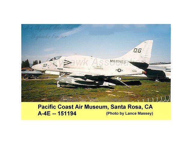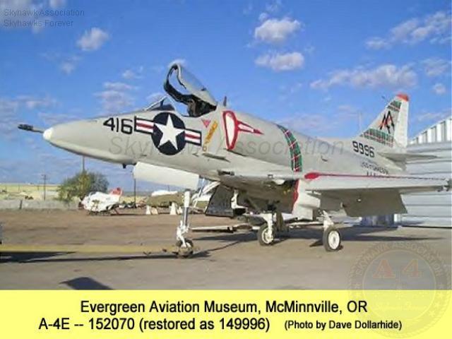 Update JUL 2013: confirmation that the a/c in question is indeed BuNo 158182, although equipped with a replacement tail. "In 1994, I was the Restoration Team manager for the DVHAA when we received 158182 from VMA-131. As you already know, 158182 had the top three feet or so of its vertical stabilizer taken off in flight when a turkey buzzard collided with the aircraft near Harrisburg, PA. The pilot managed to retain control of the aircraft and successfully brought the aircraft home despite the loss of one of the three rudder hinges. When the aircraft was stricken and given to DVHAA, another A4M had already been stricken and given to the base fire department for crash crew practice. VMA-131 swapped out the tail section from 158182 with the A4M given to the fire department, and we went on to complete a full restoration of 158182. Let me add that MSgt. Steve Baxter, who was VMA-131's Maintenance Chief at the time, personally gave me the logbooks for 158182 after the loan agreement between the National Museum of Naval Aviation and the DVHAA was completed and delivered. Today, I went over to the Wings of Freedom museum, joined by retired GySgt. Ed Miranda, who retired from active duty while serving with VMA-131, and stayed on with the squadron as a civilian tech rep working for Kay and Associates until VMA-131 flew it’s very last aircraft (BuNo 160024) to MCAS Cherry Point, into retirement. I have photographed both the data plate behind the ejection seat and the Buno plate found on the instrument panel, both showing 158182. ..." John Benton.