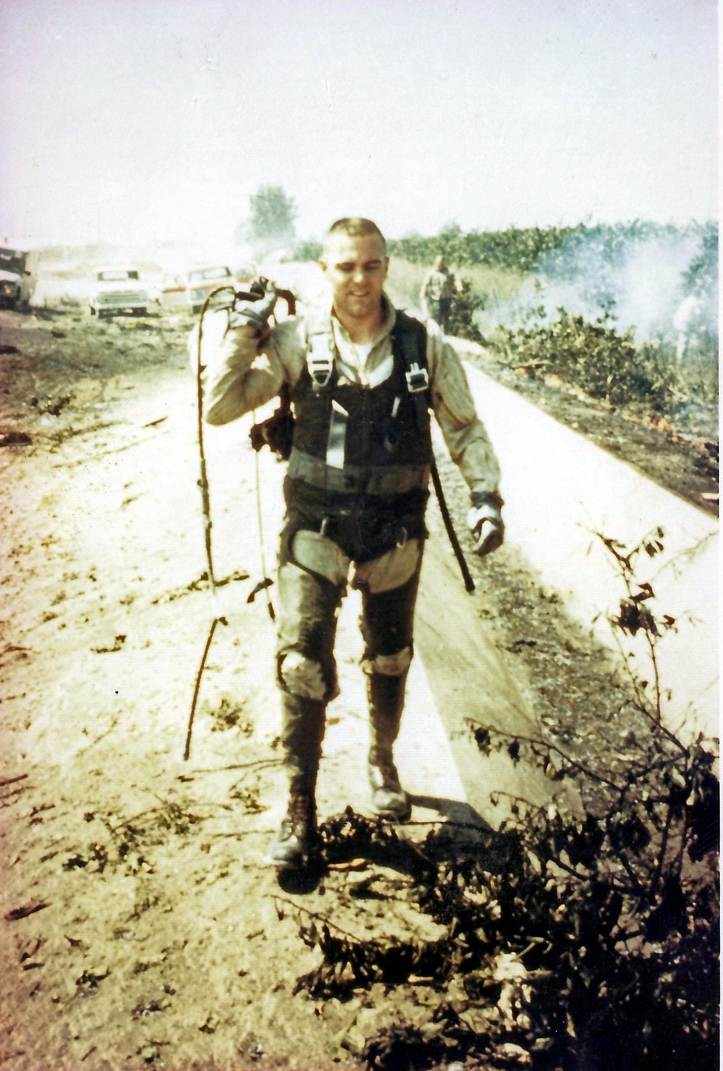 That was the first firing of the new zero-zero seat. It worked great, as I was descending, wing low, nose low, at about 10 feet. It's something like a 4 second delay to canopy deployment after ejection, seat separation and drogue firing. I was flying feet first above the Scooter, in formation looking down at it, when it impacted and exploded(full fuel). Then the chute opened. It looked like I was about to rejoin the plane, but the Arizona wind down the runway pushed me back enough to land in the Orange grove.