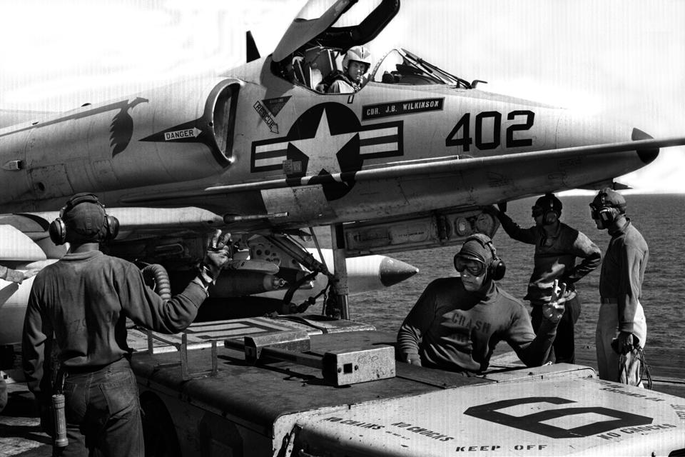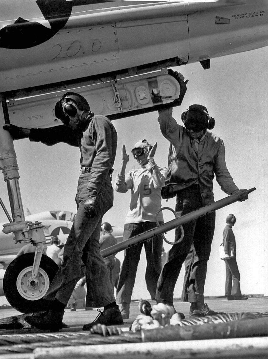 Flight deck "Huffer" starts BuNo 150062, VA-155 NL-502, a A-4E with no starter probe -1967-68. . |
