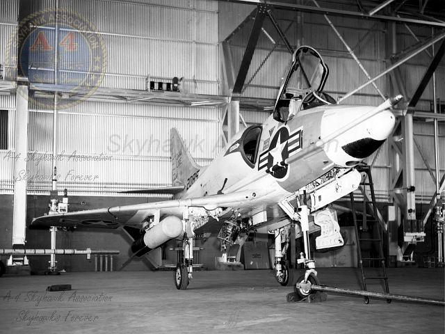 1961 Flying Ubangis Skyhawk BuNo 142719, AB-402, is manned and ready to go as the line division clears the area of starter probes and the boarding ladder. BuNo142085 at NAF China Lake with a good view of the starter probe installed in the right wing root. |