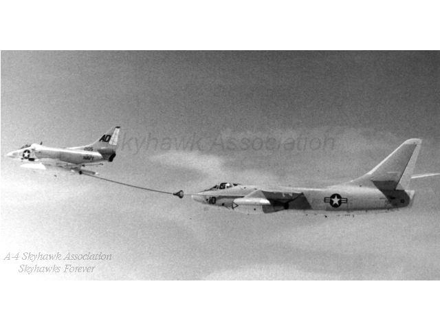 Pioneered by Douglas and the A-4 Skyhawk, the air refueling system enables the carrying aircraft to serve as a tanker for other aircraft. All fuel in the Skyhawk tanker aircraft, except the fuselage tank, may be transferred to the receiver aircraft.