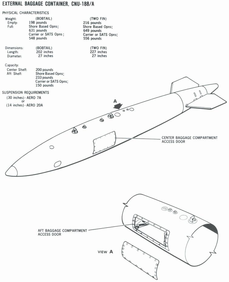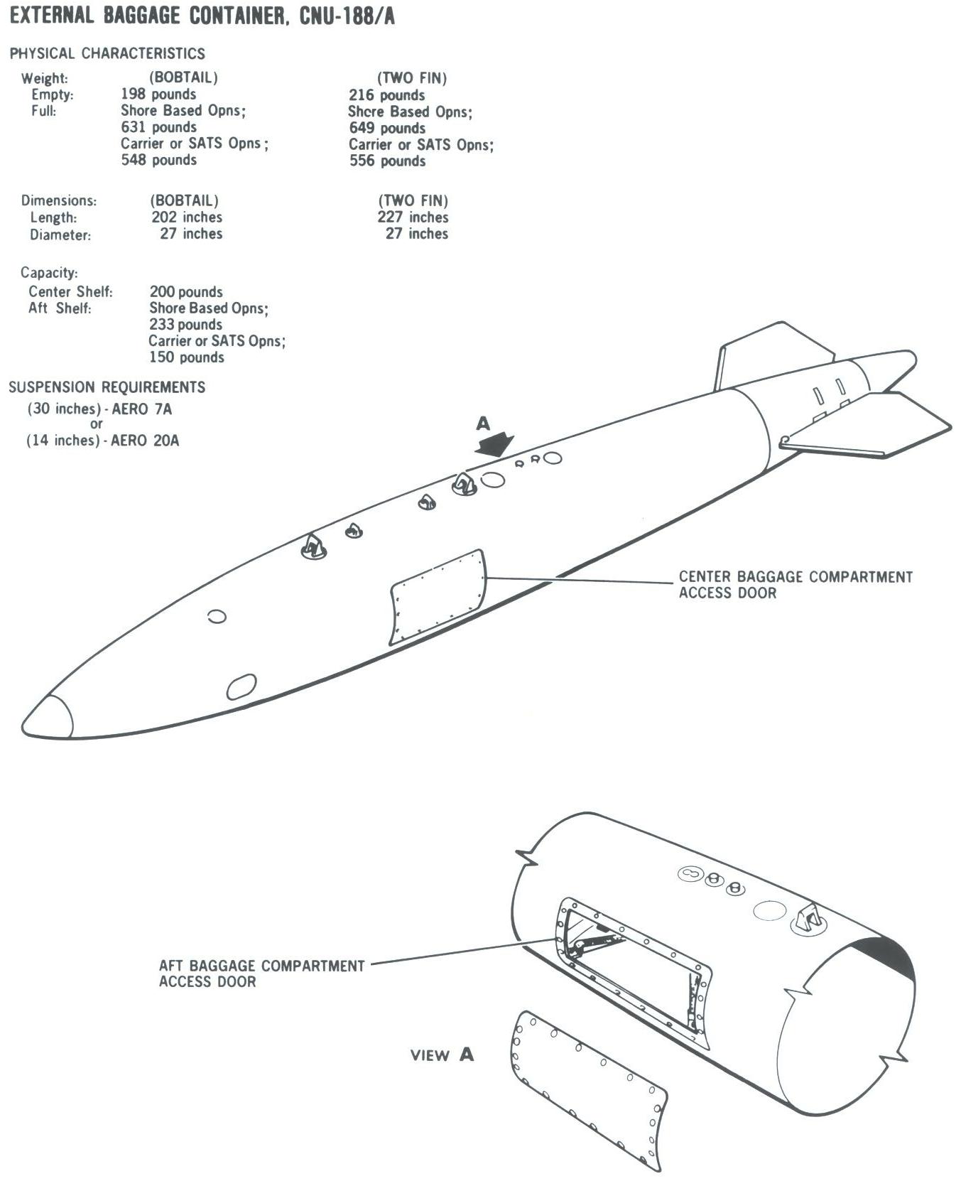| External Plyons: Centerline Aero 7A (suspension= 14 and 30 inch) Centerline w LB-18A Camera POD Wings Aero 20A (suspension= 14 inch) A-4E and A-4F reworked per AFC 546 and AAC-614 had a modified centerline plyon with the LB-18A Camera Pod. This pod contained either a DBM-4A 16mm Motion Camera or a KB-10A Still Camera Maximum External Load Capacities: External Fuel Tanks: (Useable) The Buddy Store